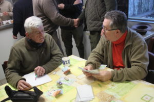 Les traqueurs continuèrent enfin la traque du Bois principal. Au niveau du poste 6-7, le petit bois du “Traquenard” abrita une compagnie entière de sangliers (11 animaux!). La plupart remontèrent le long des postes 8-9-10. 2-3 sangliers furent prélevés par les postés et traqueurs. D’autres re-rentrèrent dans le bois principal et retraversèrent toute sa longueur. 2 sangliers furent tirés par Alain au poste n°1!