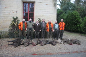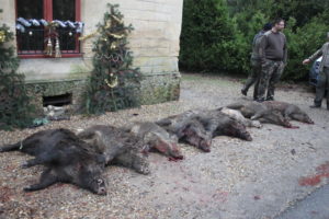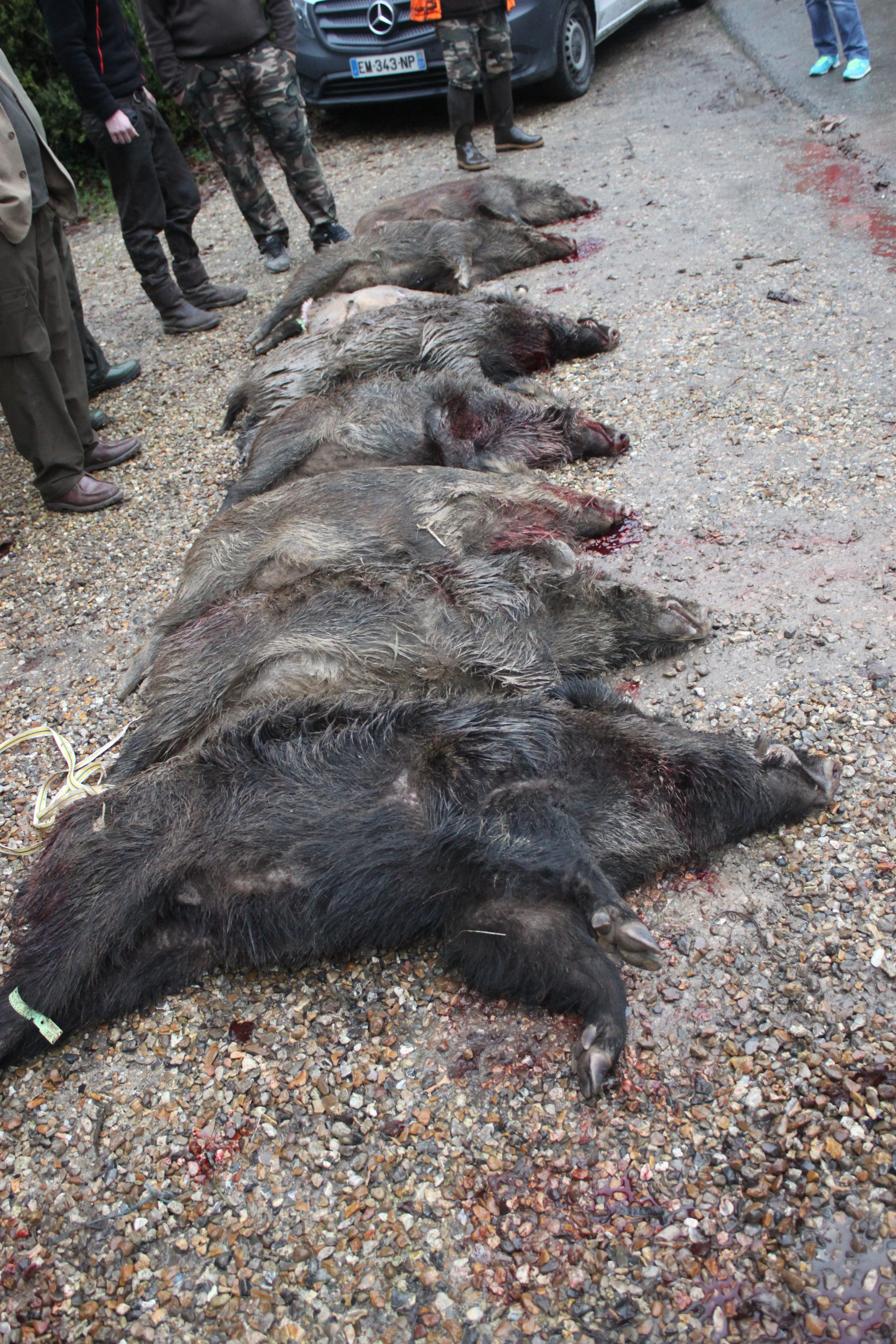 Tableau final : 7 sangliers + 1 chevreuil pris par les chiens.