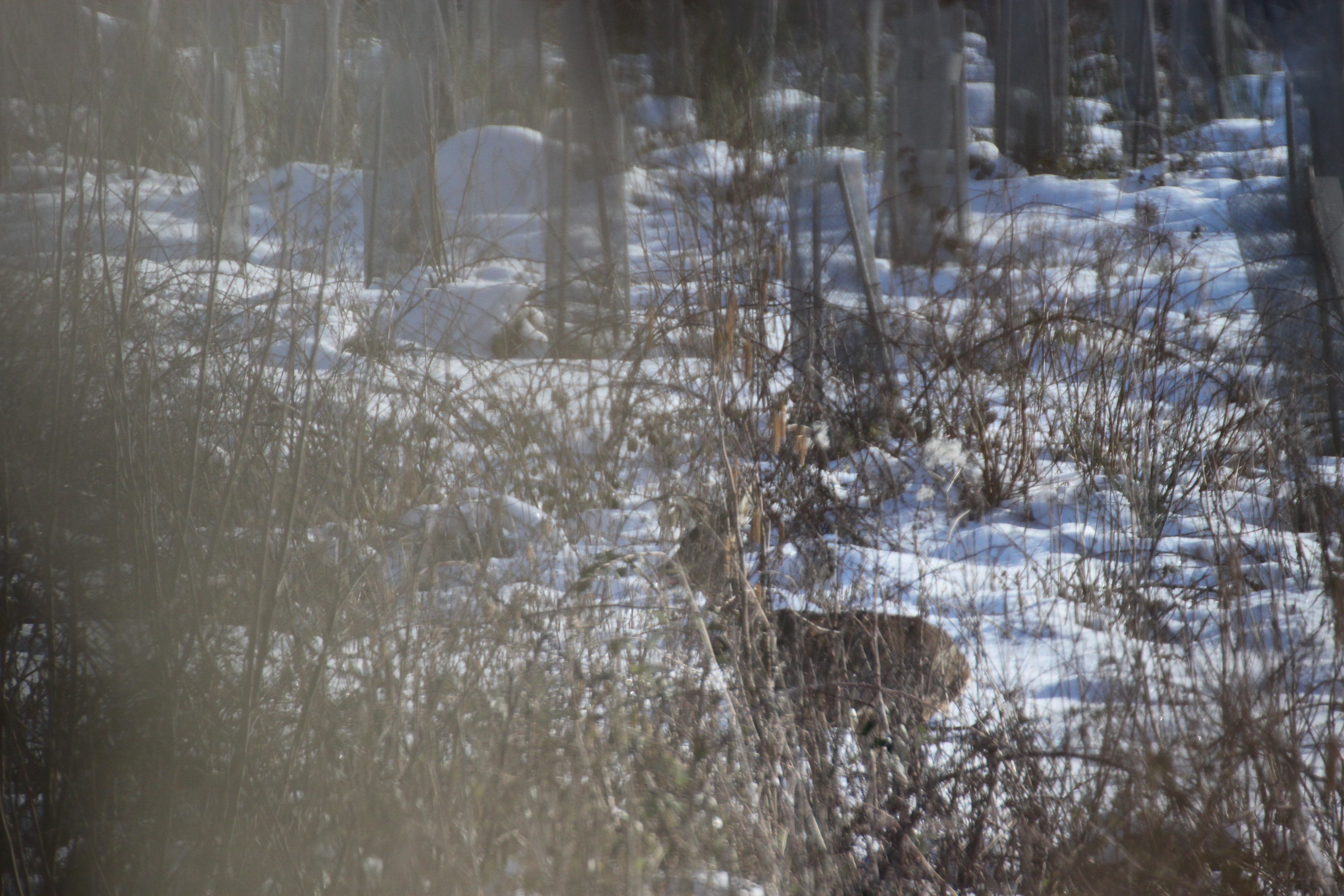 Enfin, des chevreuils fuirent vers mon poste en fin de battue : une chevrette et son jeune brocard en velours… Ils trottèrent dans la coupe en régénération, s’arrêtèrent près du poste de Christian. Au bout d’un moment, ils dépassèrent la ligne des miradors et Christian tira une nouvelle fois sans succès. Les chevreuils fuirent le long de la coupe mais trop loin pour un tir de puis mon mirador et “coulèrent” vers le bois à ma gauche. (Je suis le seul poste autorisé à tirer dans la traque à courte distance)